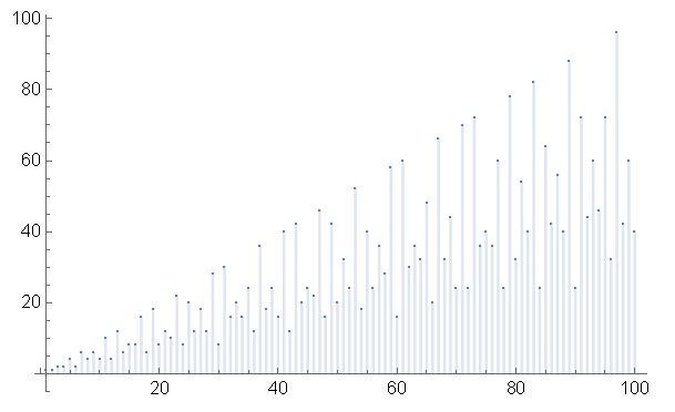 La grafica de los primeros 100 totientes es la siguiente: