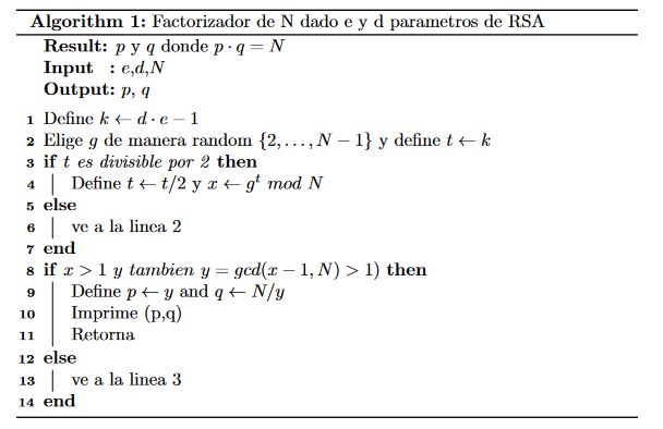 Y podemos obtener el menor de p y q mediante $\Large y = gcd(g^{\frac{d \cdot e - 1}{2^{i}}} \ - \ 1, N)$ y si $\Large \ y > 1 \ x > 1$ significa que hemos encontrado nuestros factores. Y podemos calcularlos como: