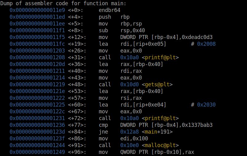 Como se observa existe una instruccion que guarda en la direccion rbp-0x4 el DWORD (32 bits) 0xdeadc0d3 mas adelante podemos ver que compara el valor de la direccion con el DWORD 0x1337bab3 y si no son iguales nos envia a la salida del programa, pero si son iguales nos entrega la flag. Ingresando una instruccion lo suficientemente grande podemos sobreescribir el registro RBP y RIP del stack.