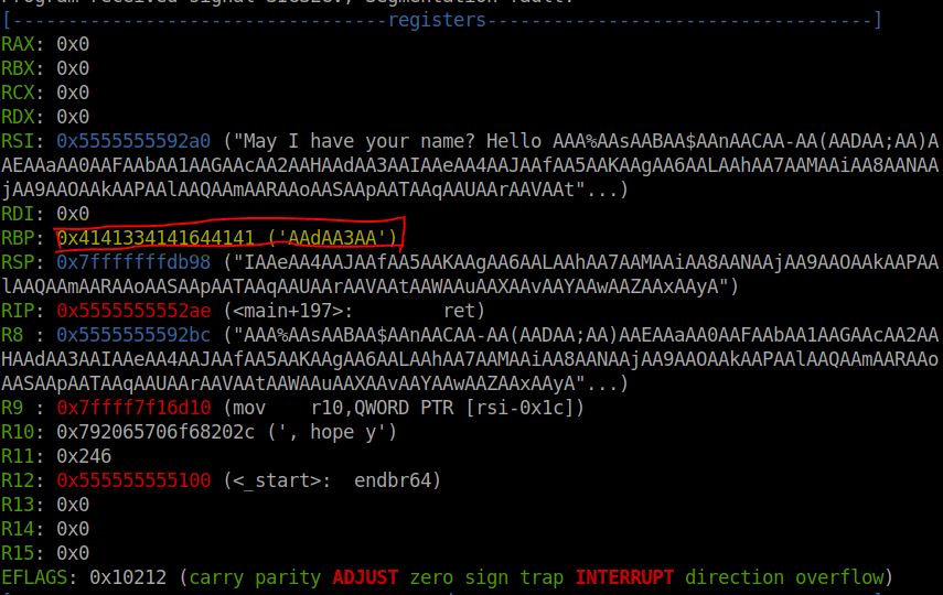 Observamos que el registro rbp fue sobreescrito ya que gets() es una funcion vulnerable a buffers overflows: