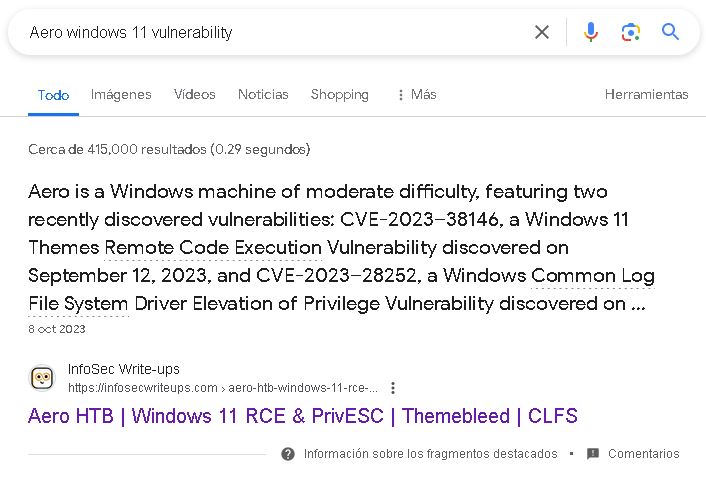 Buscando en google: “Aero windows 11 theme vulnerability” encontramos que existen 2 vulnerabilidades conocidas, tal como se muestra en la siguiete imagen: