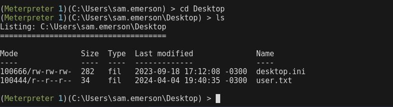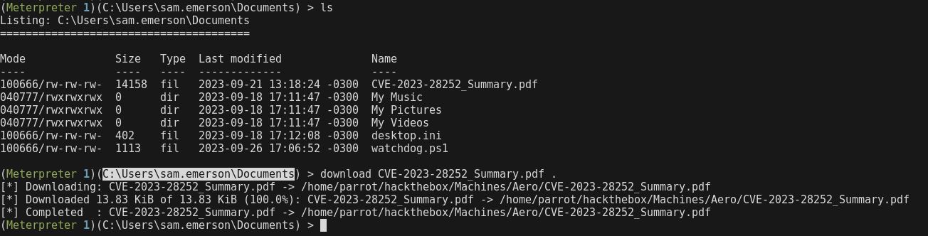 Como podemos ver en el directorio C:\Users\sam.emerson\Documents hay un archivo que tiene el nombre de una vulnerabilidad de escalada de privilegios, lo descargamos mediante meterpreter como se muestra en la siguiente imagen: