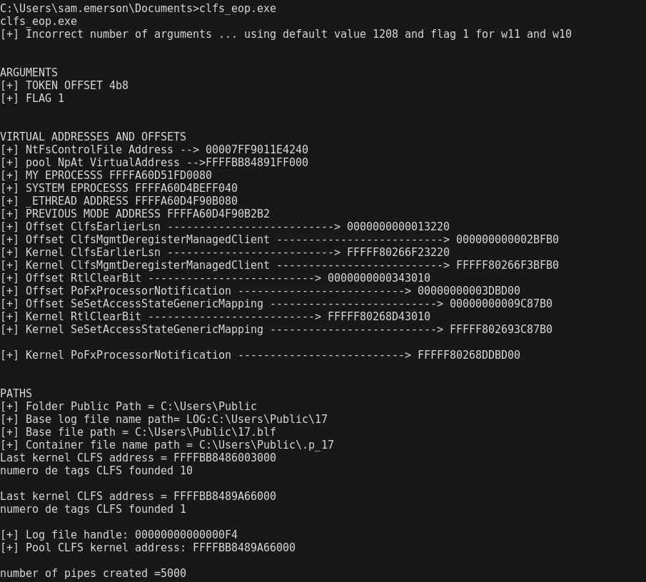 Una busqueda de la vulnerabilidad en google nos lleva al siguiente repositorio que tiene un POC. Lo clonamos y lo abrimos con vstudio. Y en archivo clfs_eop.cpp cambiamos la parte que ejecuta notepad con privilegios de sistema para que ejecuta una reverse shell de powershell. El codigo en cuestion es el siguiente: