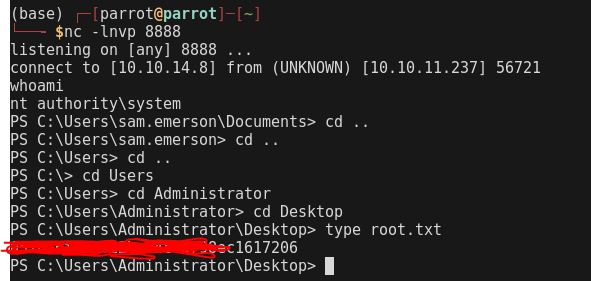Ahora deberia ver que en el netcat se abre una shell y podre extraer la flag que se encuentra en C:\Users\Administrator\Desktop\root.txt: